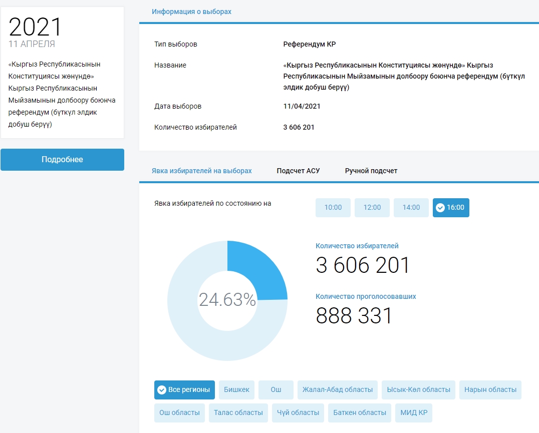 Всего свои голоса отдали 888 тысяч 331 человек. В том числе в Бишкеке — 85 тысяч 847 человек, или 20,4 процента избирателей, Оше — 49 тысяч 716 (32,72 процента), Чуйской области — 124 тысячи 661 (20,89 процента), Ошской — 189 тысяч 399 (25,94 процента), Джалал-Абадской — 182 тысячи 562 (27,13 процента), Иссык-Кульской — 75 тысяч 361 (24,24 процента), Нарынской — 59 тысяч 923 (29,34 процента), Таласской — 45 тысяч 476 (28,51 процента), Баткенской — 73 тысячи 477 (24,45 процента). За рубежом проголосовали 1 тысяча 909 человек (3,26 процента).