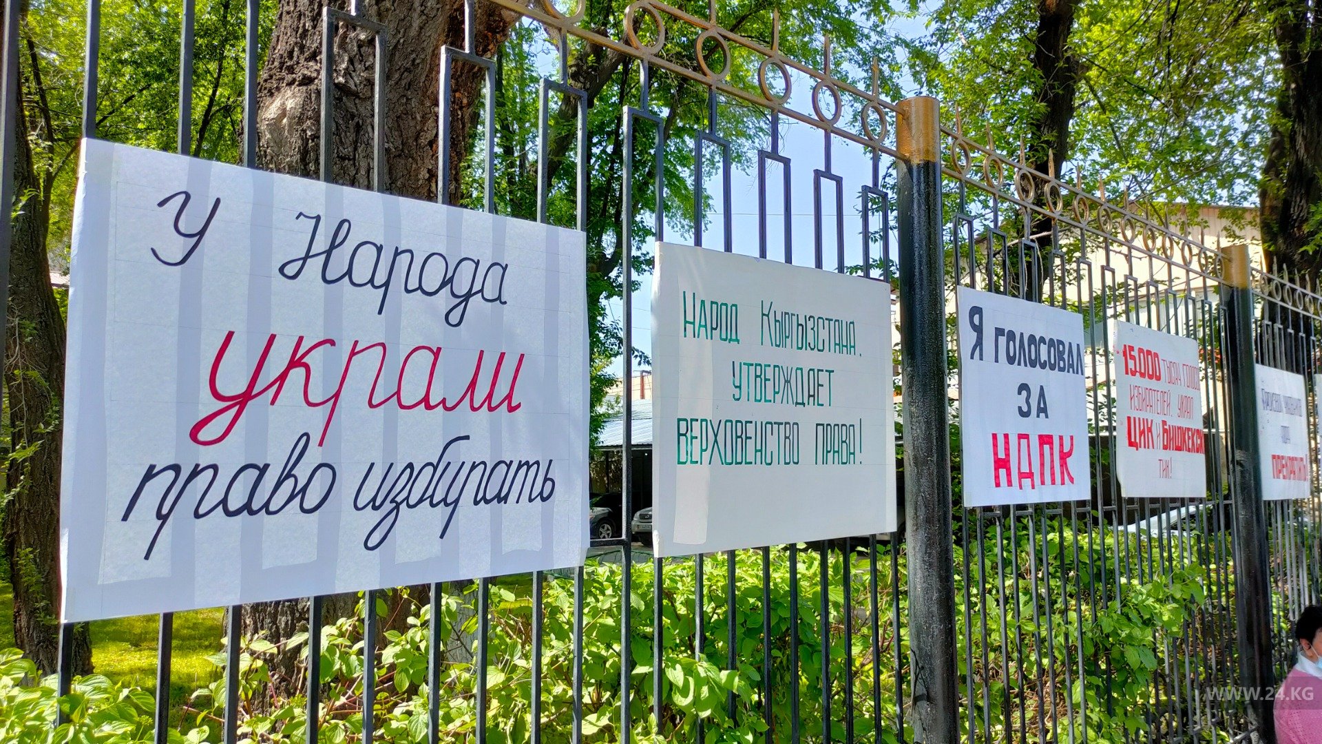 Сторонники партии НДПК второй день митингуют у здания административного суда Бишкека. Там рассматривается жалоба политобъединения на решение ЦИК об отмене регистрации списка кандидатов НДПК и признании бюллетеней с голосами избирателей, поданными за партию, недействительными.
