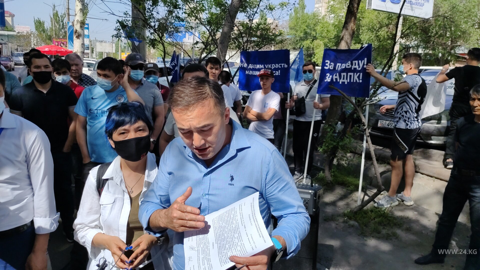 Сторонники партии НДПК второй день митингуют у здания административного суда Бишкека. Там до сих пор рассматривается жалоба политобъединения на решение ЦИК об отмене регистрации списка кандидатов НДПК и признании бюллетеней с голосами избирателей, поданными за партию, недействительными.