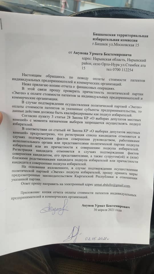 Ранее сообщалось, что «Эмгек» использовала административный ресурс (замначальника МТУ лично расклеивал баннеры «Эмгек» в новостройке «Арча-Бешик»). Оказывалось давление на квартальную Марипу Тургунову через сотрудников МВД. Был открытый подкуп избирателей путем установки новых мусорных баков и детской площадки от кандидата Русланбека Жакышева. Авторы сообщения в социальной сети также интересуются, почему ни Бишкекская ТИК, ни МВД, ни ГКНБ не обратили внимания на заявления Марипы Тургуновой.