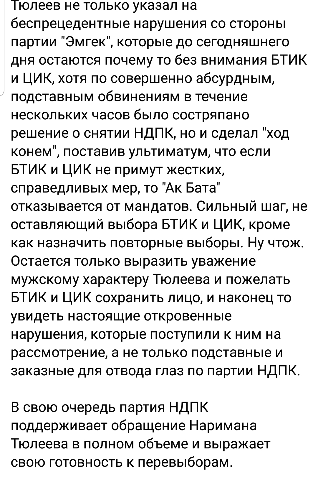 Партия НДПК поддерживает обращение Наримана Тюлеева в полном объеме и готова к перевыборам.