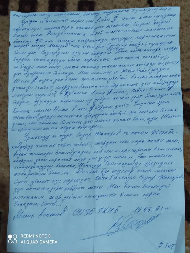 Стоит отметить, что, будучи членом ближнего круга Садыра Жапарова, сам Мелис Аспеков до ареста ни разу не озвучивал публично требования, о которых он пишет в своем письме из СИЗО ГКНБ.
