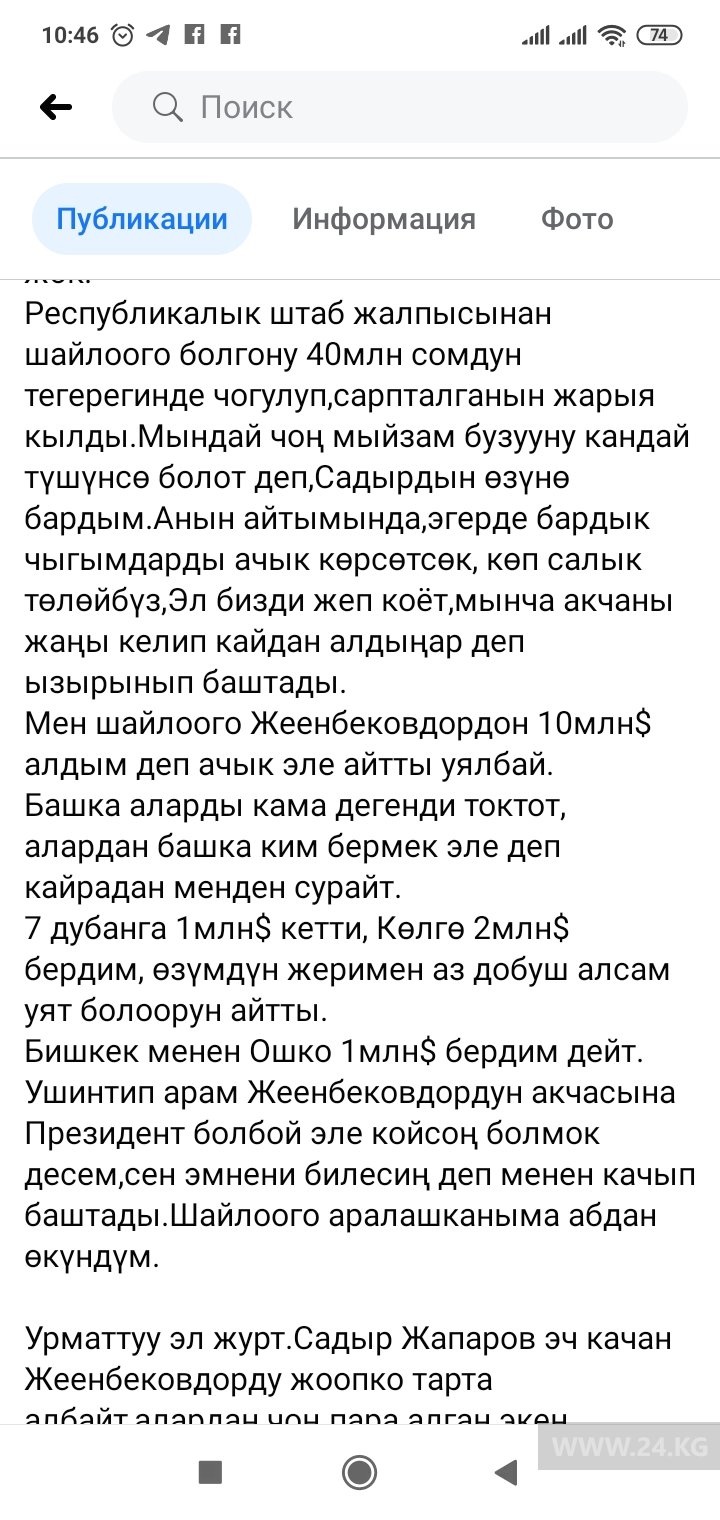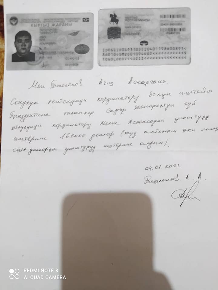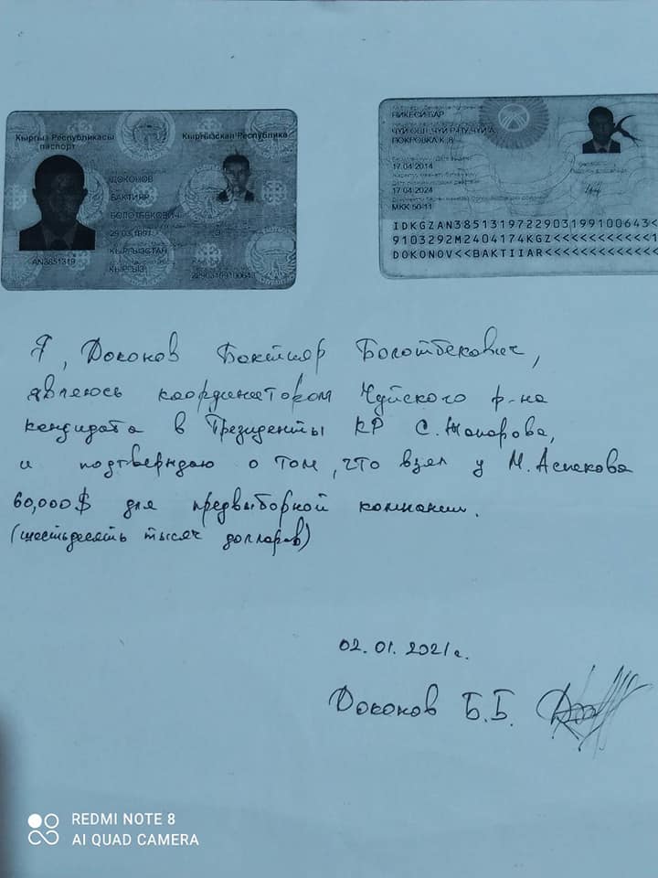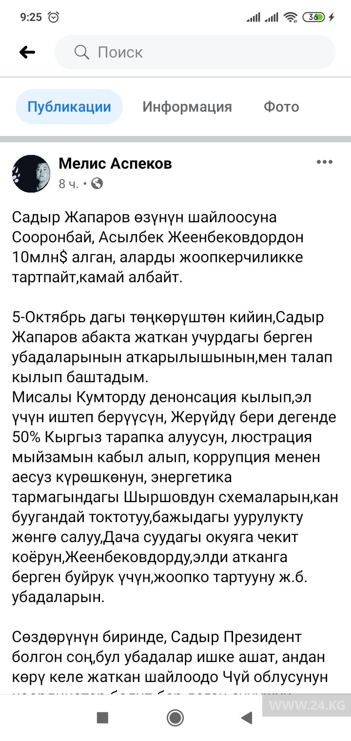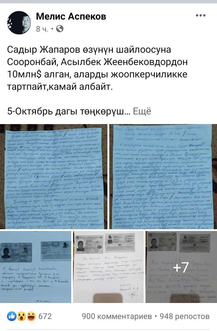 «Жапаров сказал, что ему нужен доверенный человек, чтобы проконтролировал расходы штаба. Он отметил, что, если не выиграет гонку, его посадят, поэтому надо выиграть в первом туре. Во время агитации Садыр Жапаров лично мне в руки, поделив на три части, передал $1 миллион. В доказательство своих слов я публикую копии паспортов и расписки о получении денег координаторами районов», — пишет Мелис Аспеков.