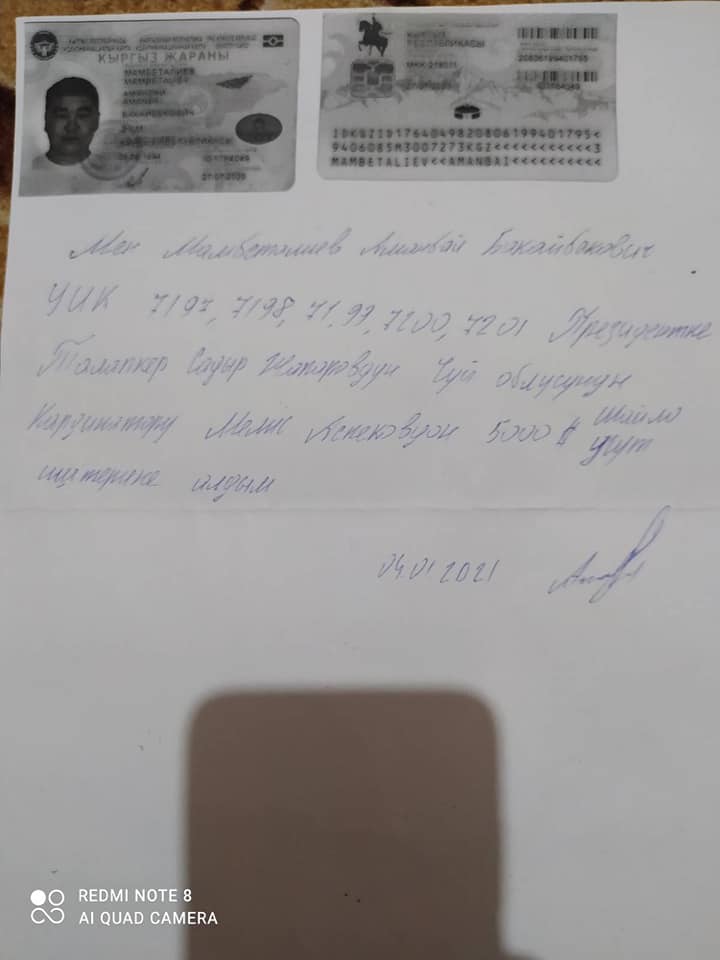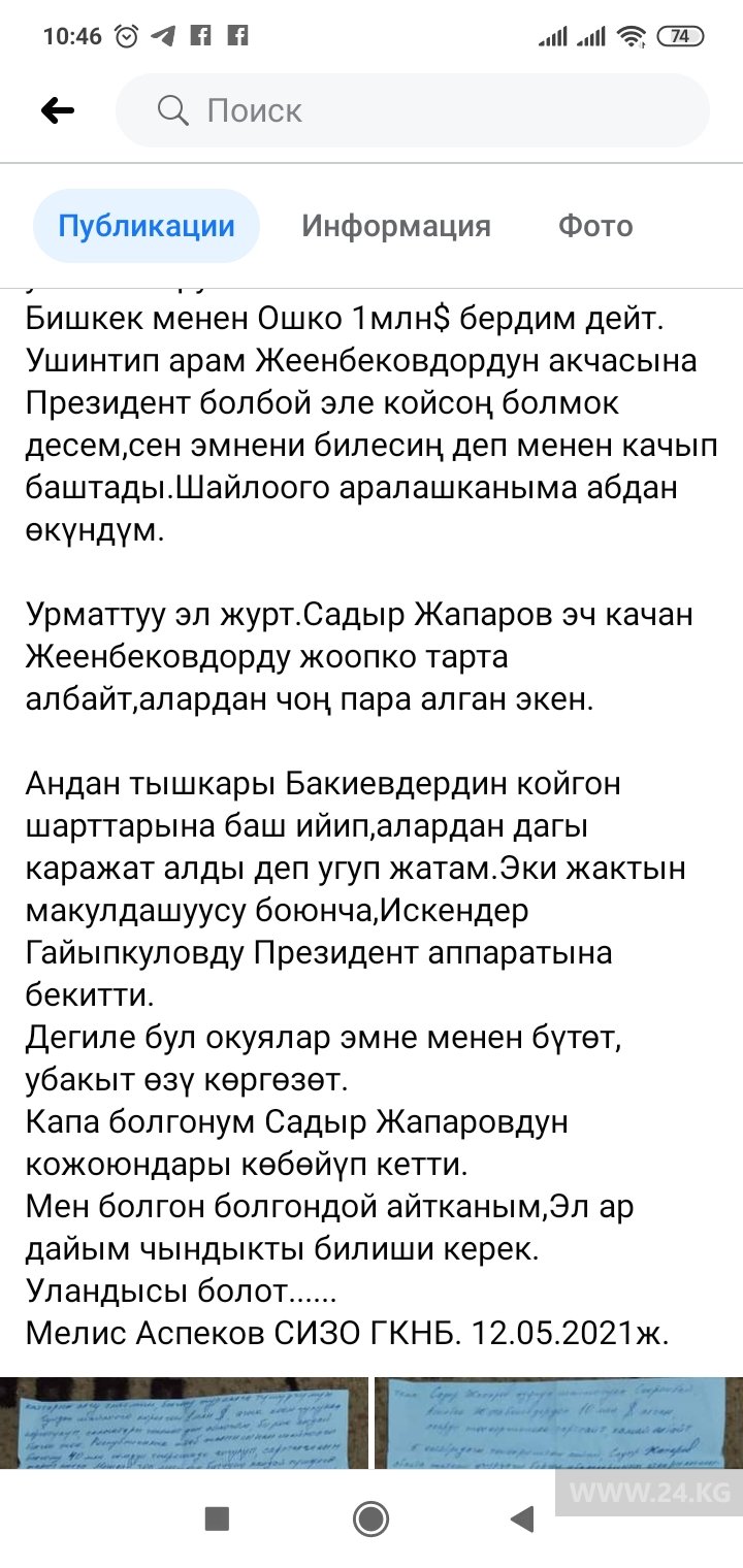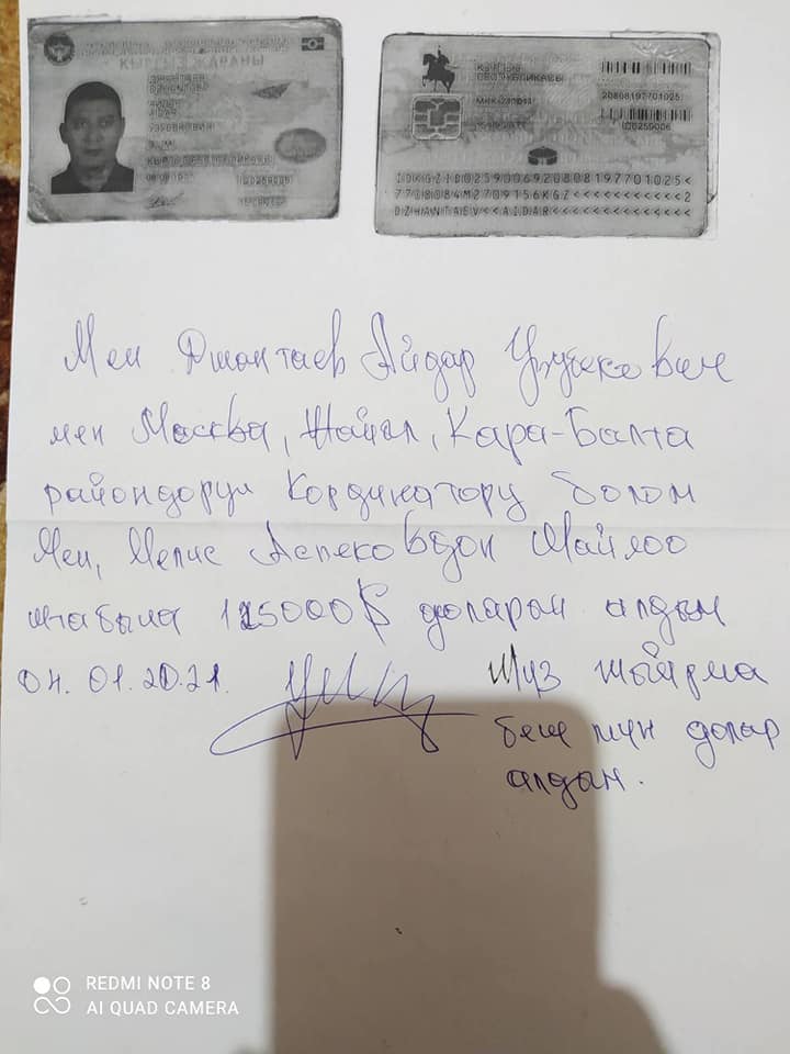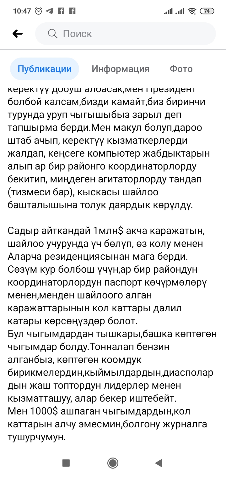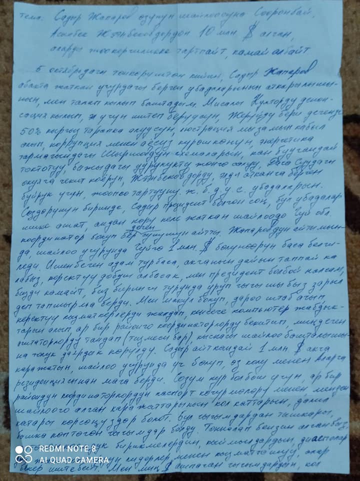 «Жапаров сказал, что ему нужен доверенный человек, чтобы проконтролировал расходы штаба. Он отметил, что, если не выиграет гонку, его посадят, поэтому надо выиграть в первом туре. Во время агитации Садыр Жапаров лично мне в руки, поделив на три части, передал $1 миллион. В доказательство своих слов я публикую копии паспортов и расписки о получении денег координаторами районов», — пишет Мелис Аспеков.