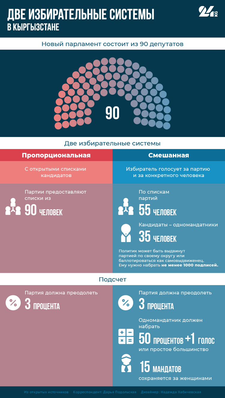 Осенью кыргызстанцам предстоит избрать седьмой созыв Жогорку Кенеша. Согласно новой Конституции, принятой на референдуме 11 апреля, выборная система будет изменена, а число депутатов сократится до 90 человек.
