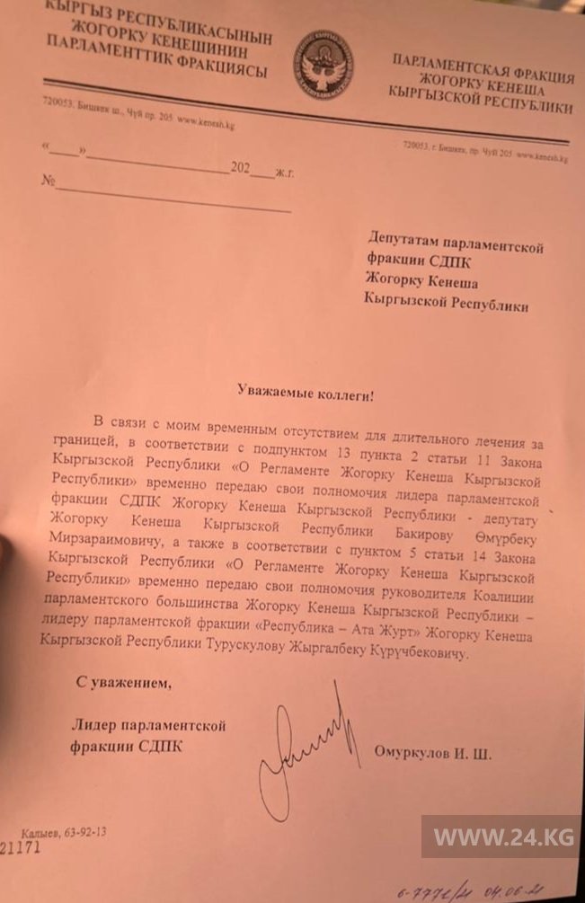 В распоряжении редакции есть документ, согласно которому Иса Омуркулов также передает свои полномочия руководителя коалиции парламентского большинства Жыргалбеку Турускулову.