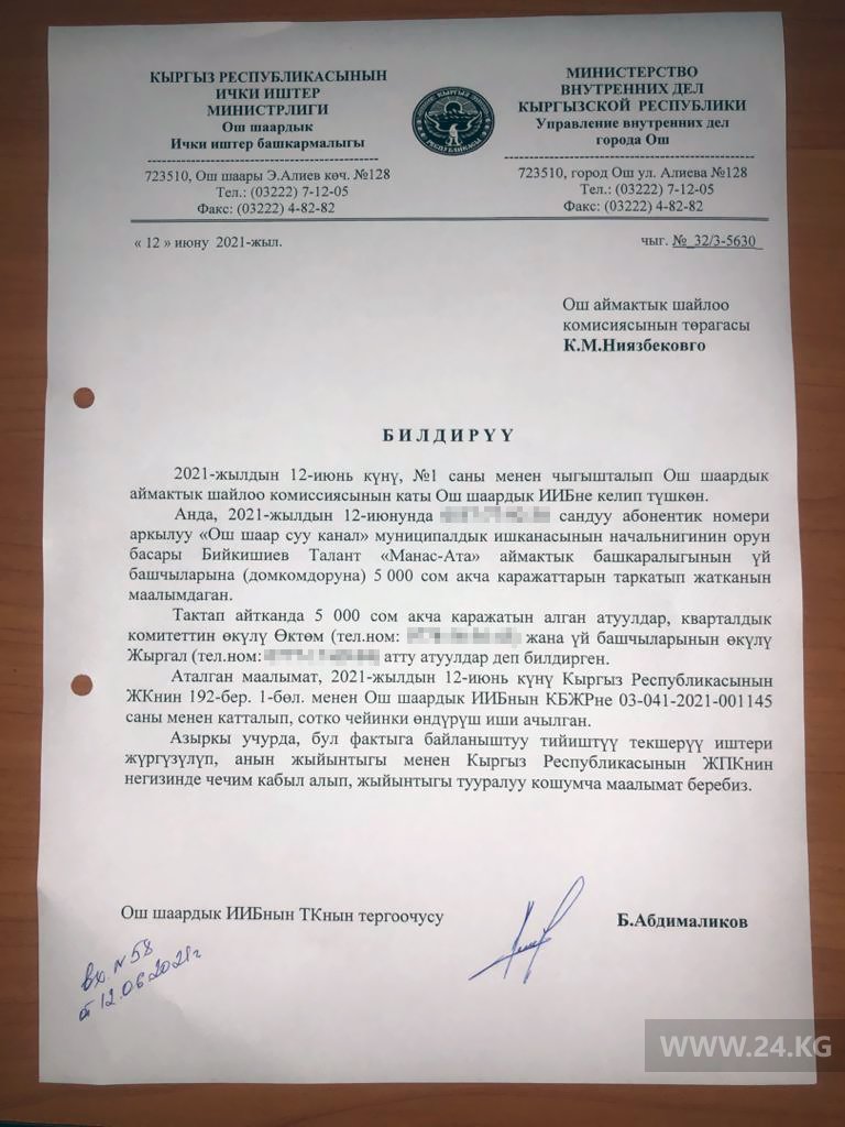 В ней указано, что заместитель начальника «Ошгорводоканала» Т.Бийкишиев раздает домкомам МТУ «Манас Ата» по 5 тысяч сомов. Как указывает заявительница, деньги получили председатель квартального комитета по имени Октом и представитель домового комитета по имени Жыргал. Обратившаяся уточнила, что указанные женщины должны были агитировать за партию «Ата Журт Кыргызстан».
