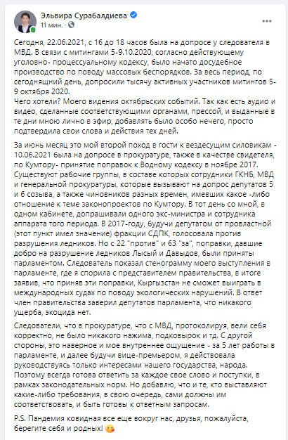 «Существуют рабочие группы, в составе которых сотрудники ГКНБ, МВД и Генеральной прокуратуры. Они вызывают на допрос депутатов 5-го и 6-го созывов, а также чиновников разных времен, имевших какое-либо отношение к теме законопроектов по «Кумтору». В 2017 году, будучи депутатом от провластной (этот пункт имел значение) фракции СДПК, голосовала против разрушения ледников. Но с 22 против и 63 за поправки, давшие добро на разрушение ледников Лысый и Давыдов, были приняты парламентом», — отметила она.