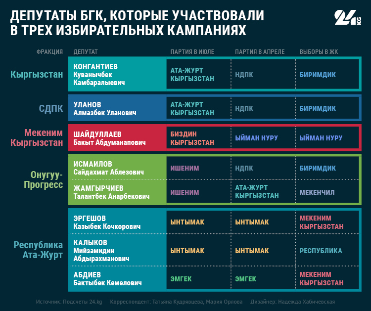 В прошлый раз в БГК Алмаз Уланов избирался от СДПК, Куванычбек Конгантиев от «Кыргызстана», а Сайдахмат Исмаилов от «Онугуу-Прогресса».