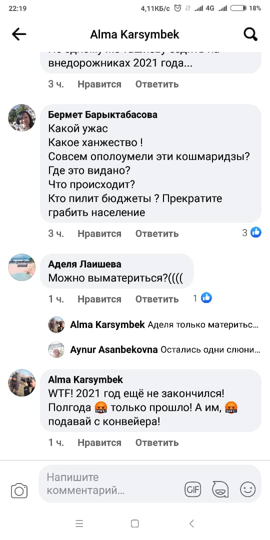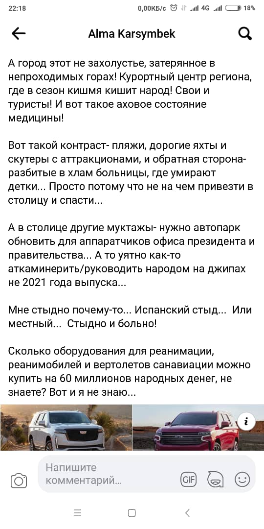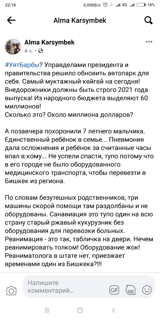 «Из народного бюджета выделяют 60 миллионов! Сколько это? Около миллиона долларов? А позавчера похоронили семилетнего мальчика. Единственный ребенок в семье. Пневмония дала осложнения, и ребенок за считанные часы впал в кому. Не успели спасти, потому что в его городе не было оборудованного медицинского транспорта, чтобы перевезти в Бишкек. По словам безутешных родственников, три машины скорой помощи там раздолбаны и не оборудованы. Санавиация — это тупо один на всю страну старый ржавый кукурузник без оборудования для перевозки больных. Реанимация — это так, табличка на двери. Нечем реанимировать толком! Оборудования нет, реаниматолога в штате нет, приезжает временами один из Бишкека», — возмущена пользователь Facebook Алма Карсымбек.