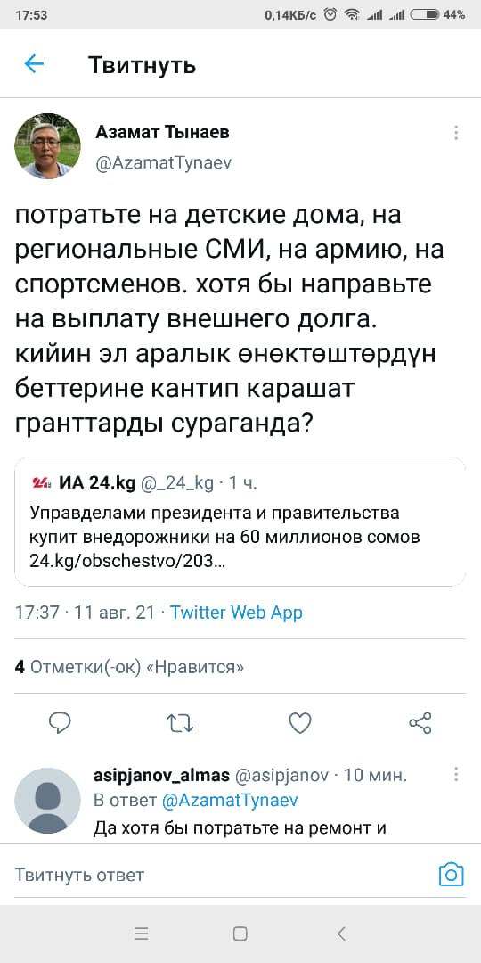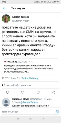 Пользователь Twitter Азамат Тынаев перечислил варианты, куда можно рациональнее потратить бюджетные средства: на детские дома, региональные СМИ, армию, спортсменов, на уплату внешнего долга.