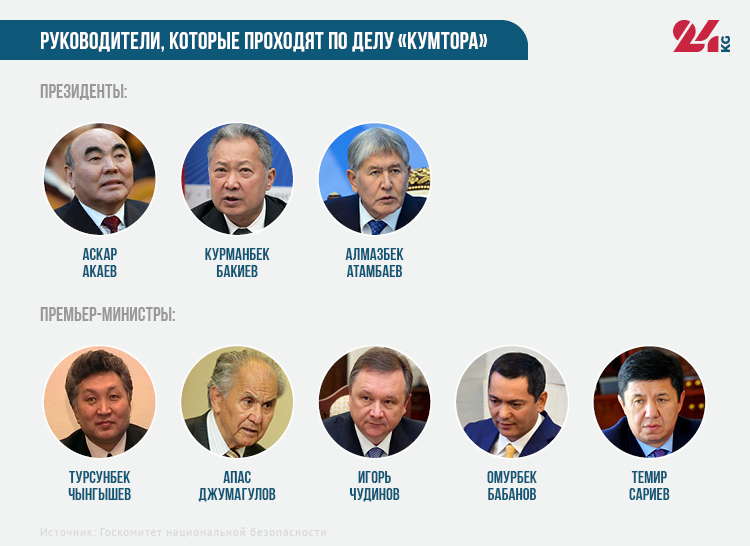 Начатое новыми властями Кыргызстана расследование соглашений, заключенных по проекту «Кумтор», добавило проблем многим бывшим чиновникам. Например, прибавилось обвинений экс-президентам Аскару Акаеву, Курманбеку Бакиеву и Алмазбеку Атамбаеву. Досталось и бывшим премьерам.