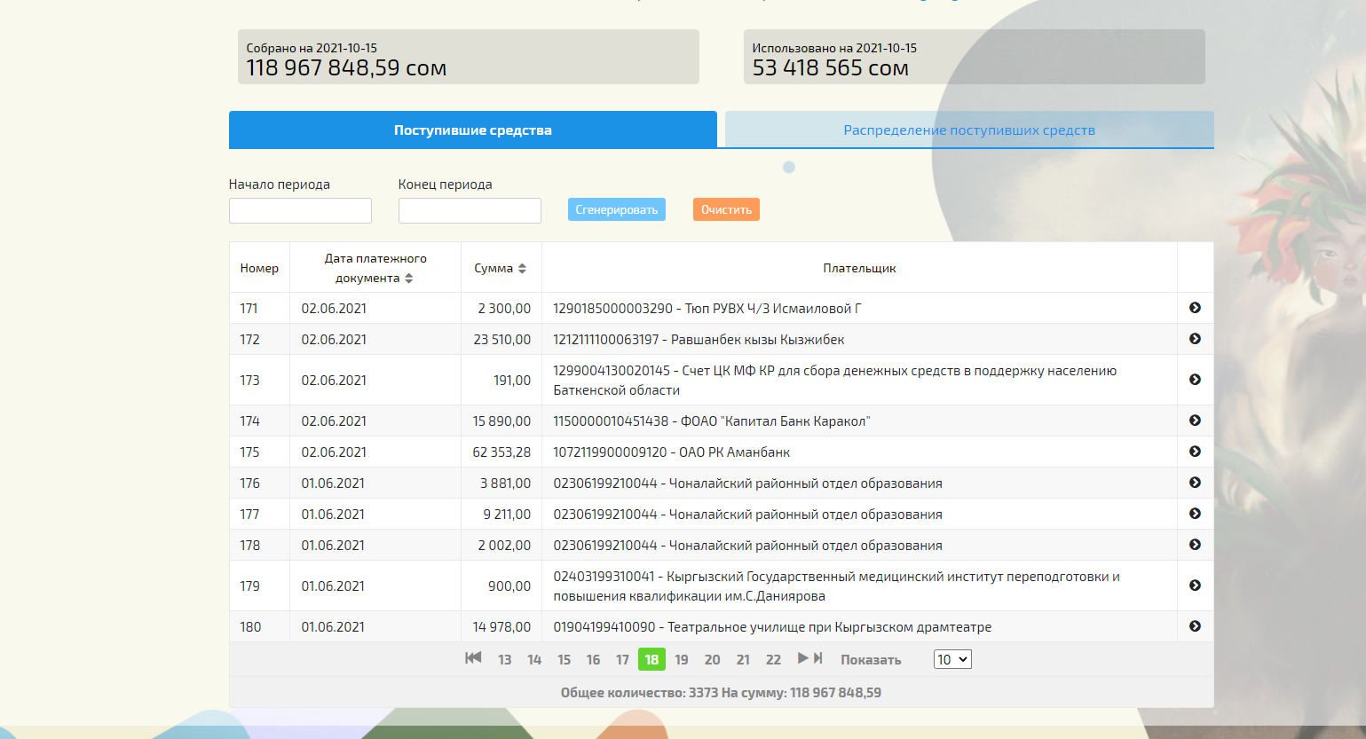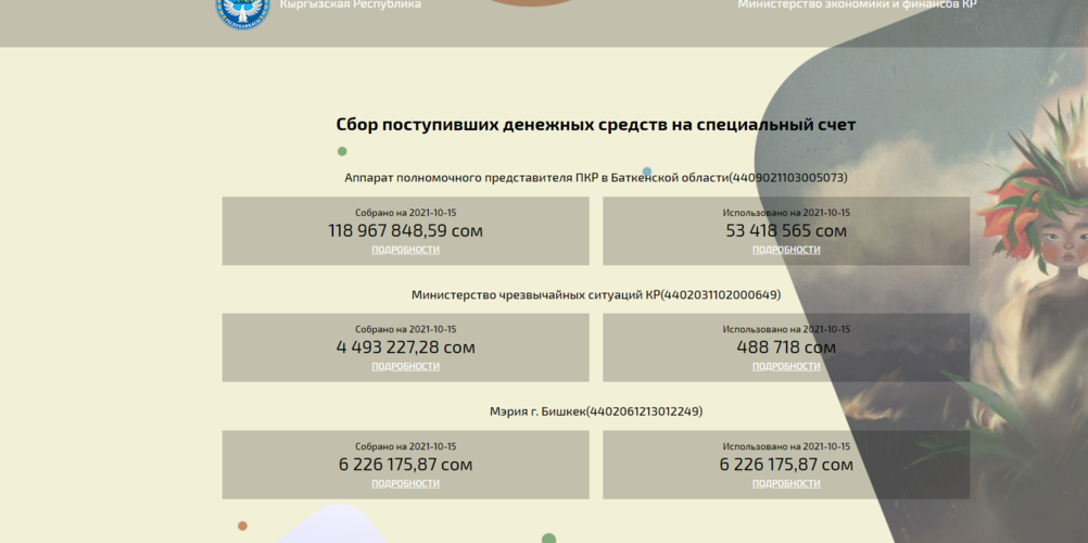 Самую большую сумму собрало полномочное представительство президента в Баткенской области. На специальном счете у аппарата обладминистрации саккумулировано почти 120 миллионов, включая 6 миллионов от мэрии Бишкека.