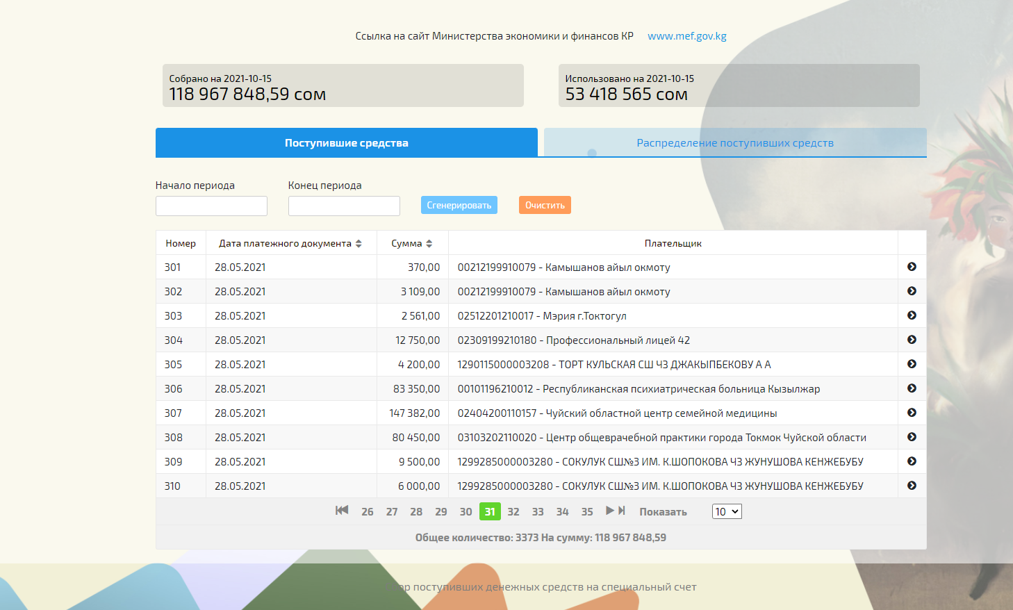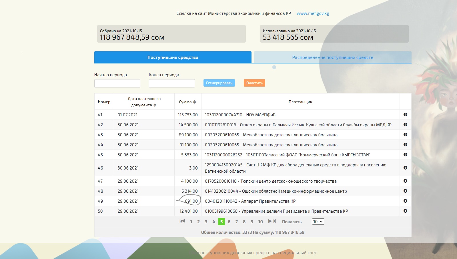 45 миллионов 338 тысяч сомов из собранных средств обладминистрация уже потратила. Хотя на сайте указано, что расходы на 7 миллионов выше — 53 миллиона 418 тысяч сомов. В аппарате полпреда сообщили, что всего договор с подрядчиками составлен на 72 миллиона 683 тысячи сомов.