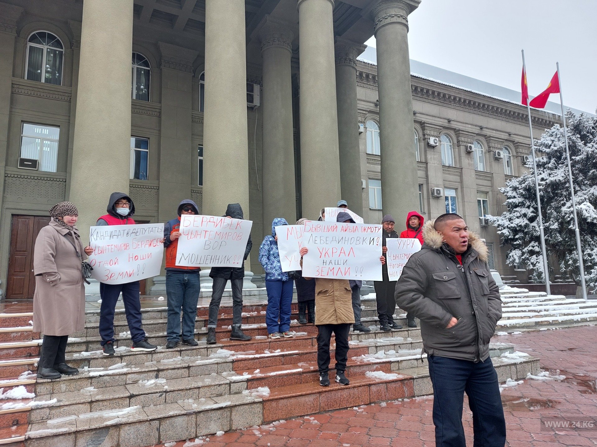 На акцию протеста вышли 13 человек. Они заявляют, что пострадали от мошеннических действий бывшего главы Лебединовского айыл окмоту Бердибека Чынтемирова.