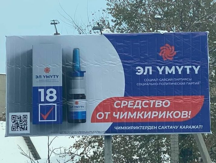 Партия «Эл умуту» одна из немногих, кто развесил баннеры на улицах. Однако что хотели донести народу ее члены, непонятно. К примеру, билборд с кандидатами в костюмах героев легендарной «Матрицы» — что подразумевает? Или размещенный на другом баннере флакон с надписью «Средство от чимкириков»? Поддеть депутатов шестого созыва? Сострить? Показать, что кандидаты лучше прежних? Смеем утверждать, что ни одной из этих целей авторы «креатива» не добились — низкопробная шутка.