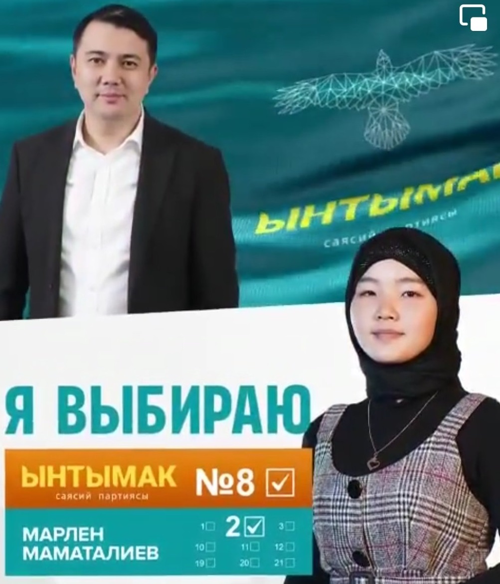 Неоднозначную реакцию вызвал у пользователей соцсетей баннер «Ынтымака». На нем изображен лидер партии Марлен Маматалиев, а рядом девушка в хиджабе и слоган «Я выбираю «Ынтымак». Что хотели этим сказать или показать в политорганизации, тоже неясно.