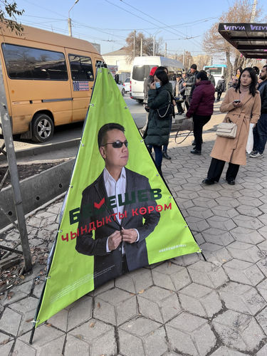 Есть баннеры и у партии детей бывшего президента Алмазбека Атамбаева «Социал-демократы». Но незамысловатые. На растяжке сам Атамбаев, хотя он на выборы не идет. Рядом с ним верная соратница Ирина Карамушкина. Оба проходят фигурантами уголовного дела о событиях в Кой-Таше 7-8 августа 2019 года. На этом же баннере Темирлан Султанбеков. В списке его, как и Атамбаева, нет. Баллотироваться Султанбекову не позволяет возраст. Ему не исполнилось 25 лет.