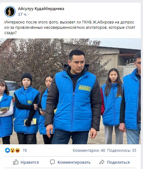«Помощница другого кандидата Равшана Джеенбекова — Айсулуу Кудайбердиева опубликовала пост в Facebook о том, почему на допрос не вызывают Абирова за привлечение несовершеннолетних в агитации. Девочки на фотографии, которые стоят позади меня, являются официальными агитаторами, у них есть патенты, агитационный договор, они официально оформлены. Все агитаторы совершеннолетние, кто-то из них учится на заочном отделении университета, кто-то не учится, а кто-то работает дизайнером», — сказал Жаныбек Абиров.