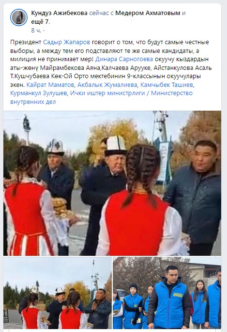 В Таласе кандидата в депутаты по одномандатному округу Эмиля Абдыкадырова во время агитации встречали школьницы. Об этом на своей станице в Facebook написала активистка Кундуз Ажибекова.