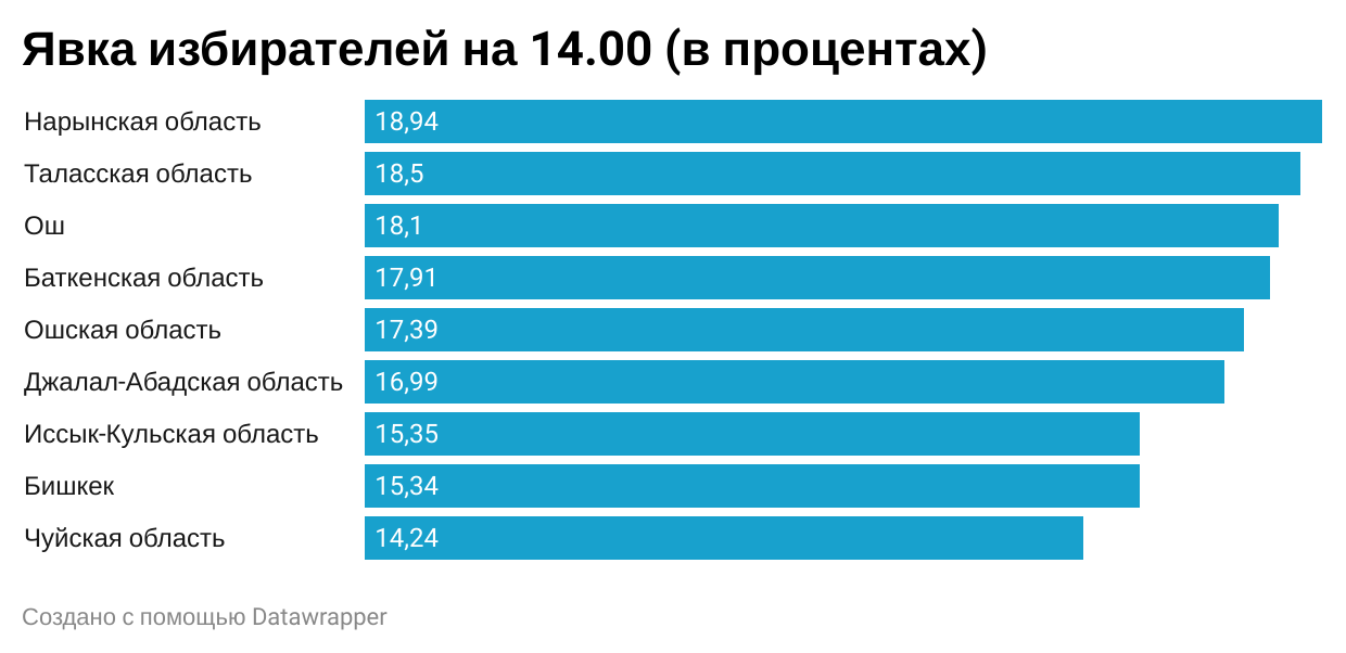 Всего голоса по единому избирательному округу отдали 602 тысячи 432 человека. Самая высокая явка в Нарынской и Таласской областях, самая низкая — в Бишкеке и Чуйской области.