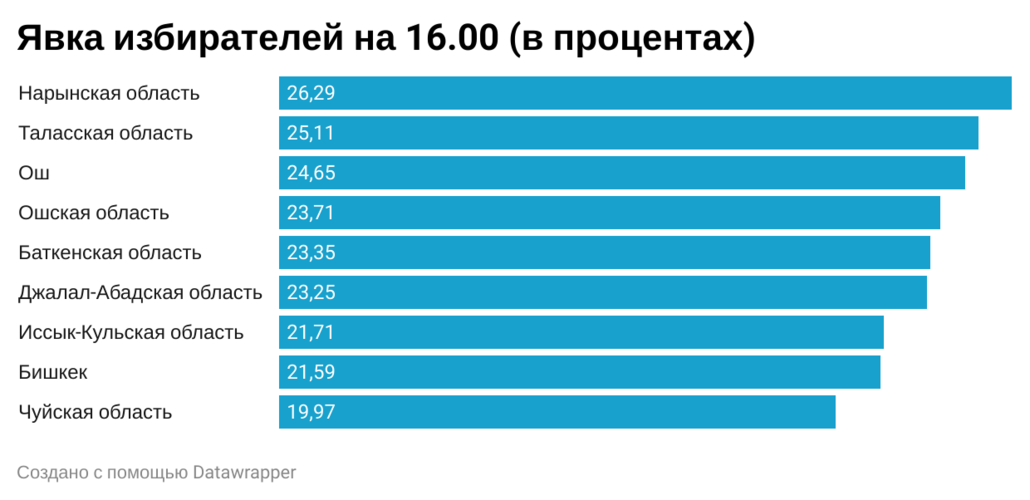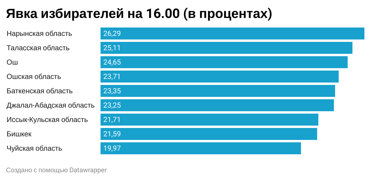 Всего голоса по единому избирательному округу отдали 829 тысяч 171 человек. Самая высокая явка в Нарынской и Таласской областях, самая низкая — в Бишкеке и Чуйской области.