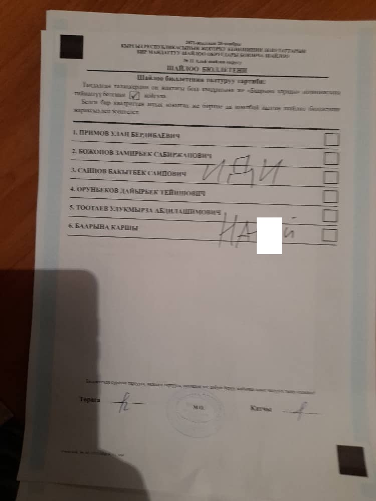 На кадрах видно, что избиратели написали на них нецензурные слова. Еще на одном под списком партий написали имя Асылбека Жээнбекова, правда, с ошибкой.