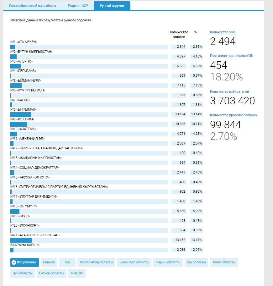 Интересно, что на данный момент подсчитали всего около 16 процентов протоколов с избирательных участков. Итоги выборов в Жогорку Кенеш могут объявить только по итогам ручного пересчета.