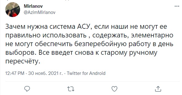 Ранее на сайте Центризбиркома произошел сбой: были опубликованы данные с ошибкой. Позже там объяснили, что разработаны две программы по системе избрания депутатов — система автоматического подсчета голосов в урне и программа свода данных и их отображения. «На сайт сначала загрузили не ту программу», — сообщила председатель ЦИК Нуржан Шайлдабекова.