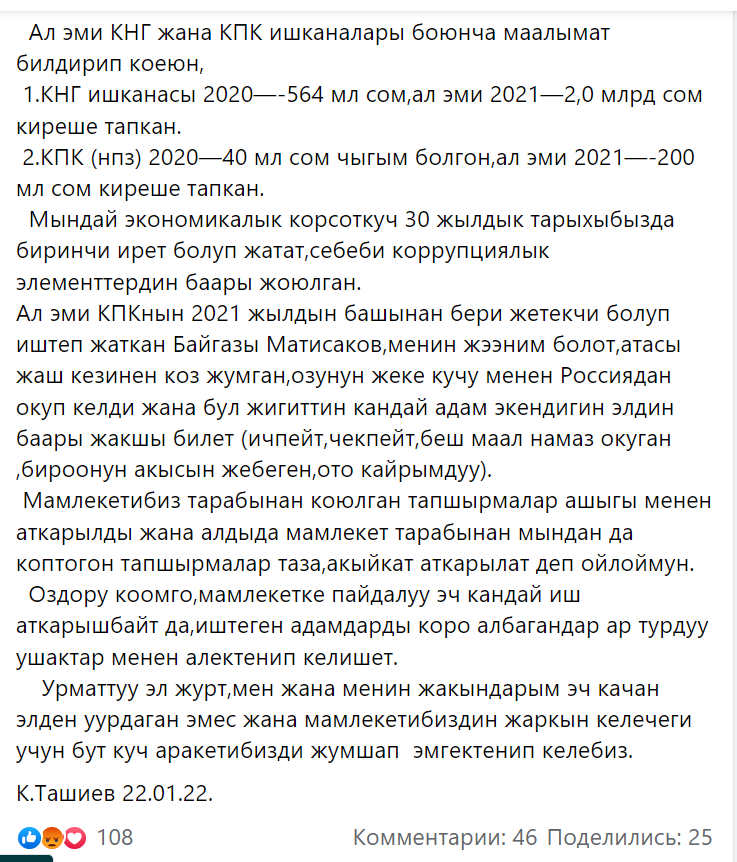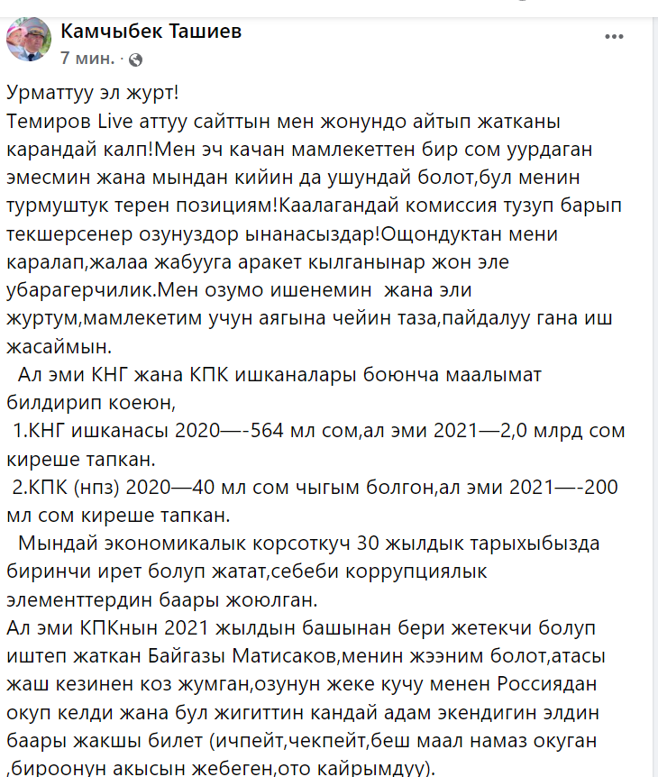 «Я не украл у государства ни тыйына, и впредь так и будет. Это моя жизненная позиция. Можете создать любую комиссию для проверки, и вы в этом убедитесь. Попытка очернения и возведение ложного обвинения — это напрасная трата времени. Я верю в себя и буду работать во благо государства до конца своей жизни», — написал Камчыбек Ташиев.