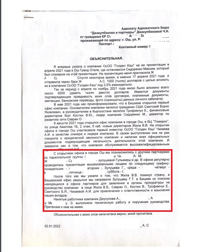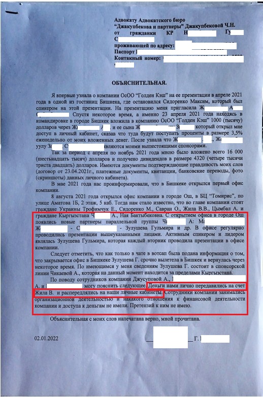 В объяснительной одной из вкладчиц указывается, что Гулмира Зулушева присутствовала во время открытия офиса компании «Голден кэш» в городе Оше. Она якобы являлась активным спикером и лидером.