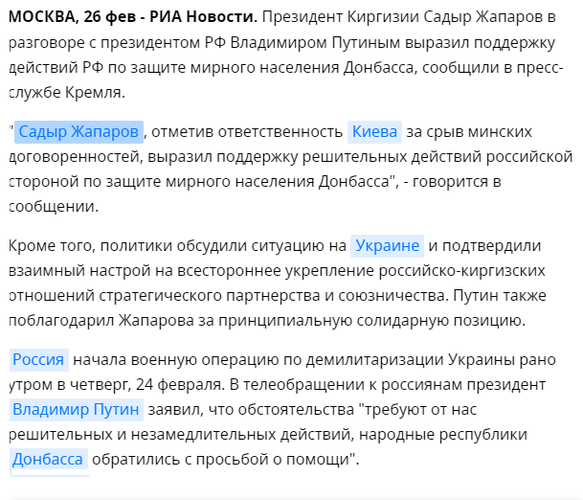РИА Новости сообщило, что в телефонном разговоре президент Кыргызстана Садыр Жапаров «выразил поддержку действиям России по защите мирного населения Донбасса».