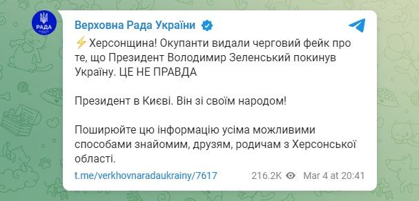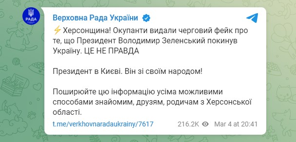 В своем Telegram-канале Рада назвала информацию об отъезде Зеленского «фейком».