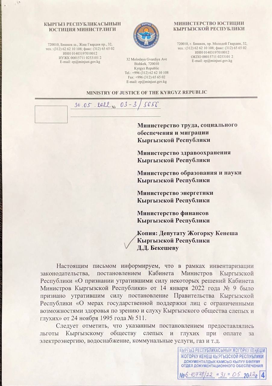Он опубликовал письмо от Минюста, где говорится, что в рамках инвентаризации законодательства было признано утратившим силу постановление правительства «О мерах господдержки лиц с ограниченными возможностями здоровья по зрению и слуху Кыргызского общества слепых и глухих».