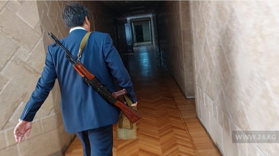 Нардеп Жусупбек Коргонбай уулу вышел из зала заседания с оружием. Журналистам он заявил, что это муляж, который он купил сыну.