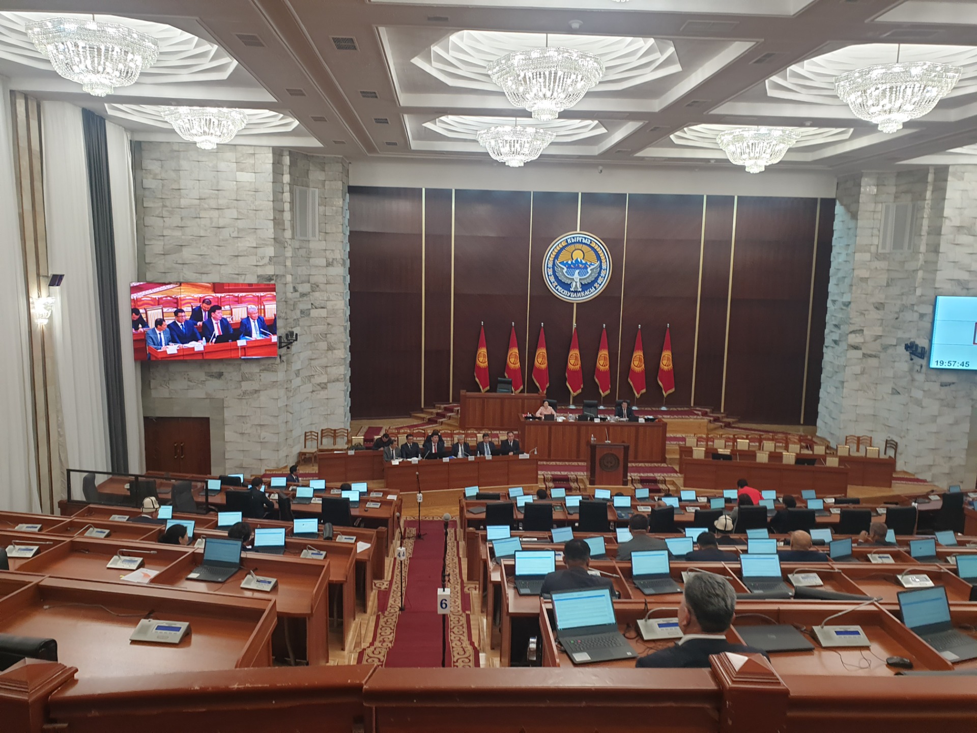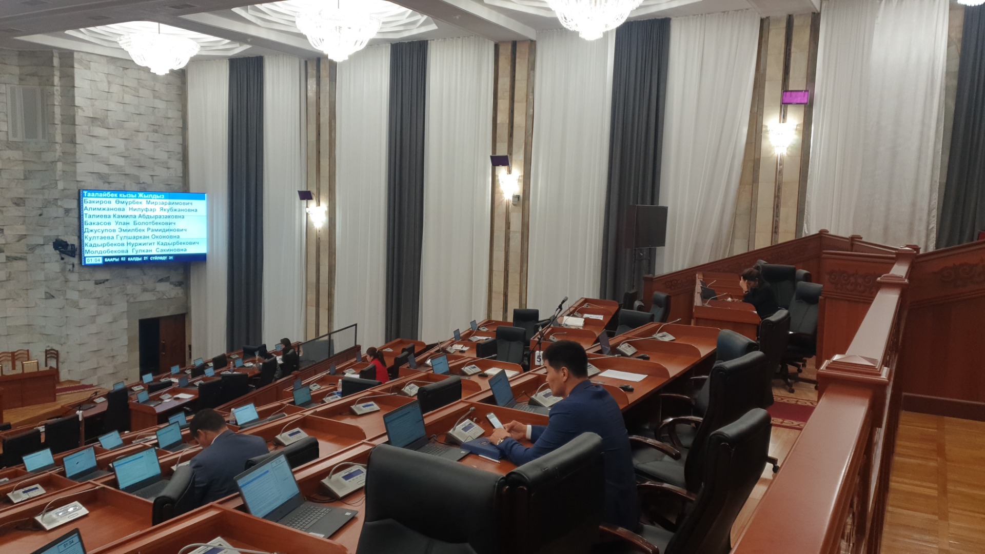 В зале заседаний присутствуют всего 30 нардепов: Эрулан Кокулов, Эльмурза Сатыбалдиев, Айгуль Айдарова, Эмиль Жамгырчиев, Женишбек Токторбаев, Нурбек Сыдыгалиев, Шайлообек Атазов, Шайырбек Ташиев, Камила Талиева, Нилуфар Алимжанова, Жылдыз Таалайбек кызы, Медер Алиев, Надира Нарматова, Нурлан Ражабалиев, Жалолидин Нурбаев, Аманкан Кенжебаев, Винера Раимбачаева, Ырысбек Атажанов, Миргуль Темиралиева, Жаныбек Кыдыкбаев, Улан Бакасов, Айбек Алтынбеков, Нурбек Азыгалиев, Карим Ханджеза, Мурадил Сыдыков, Бакыт Тентимишов, Жамиля Исаева, Гулшаркан Култаева, Айбек Алтынбеков и Арсланбек Малиев.