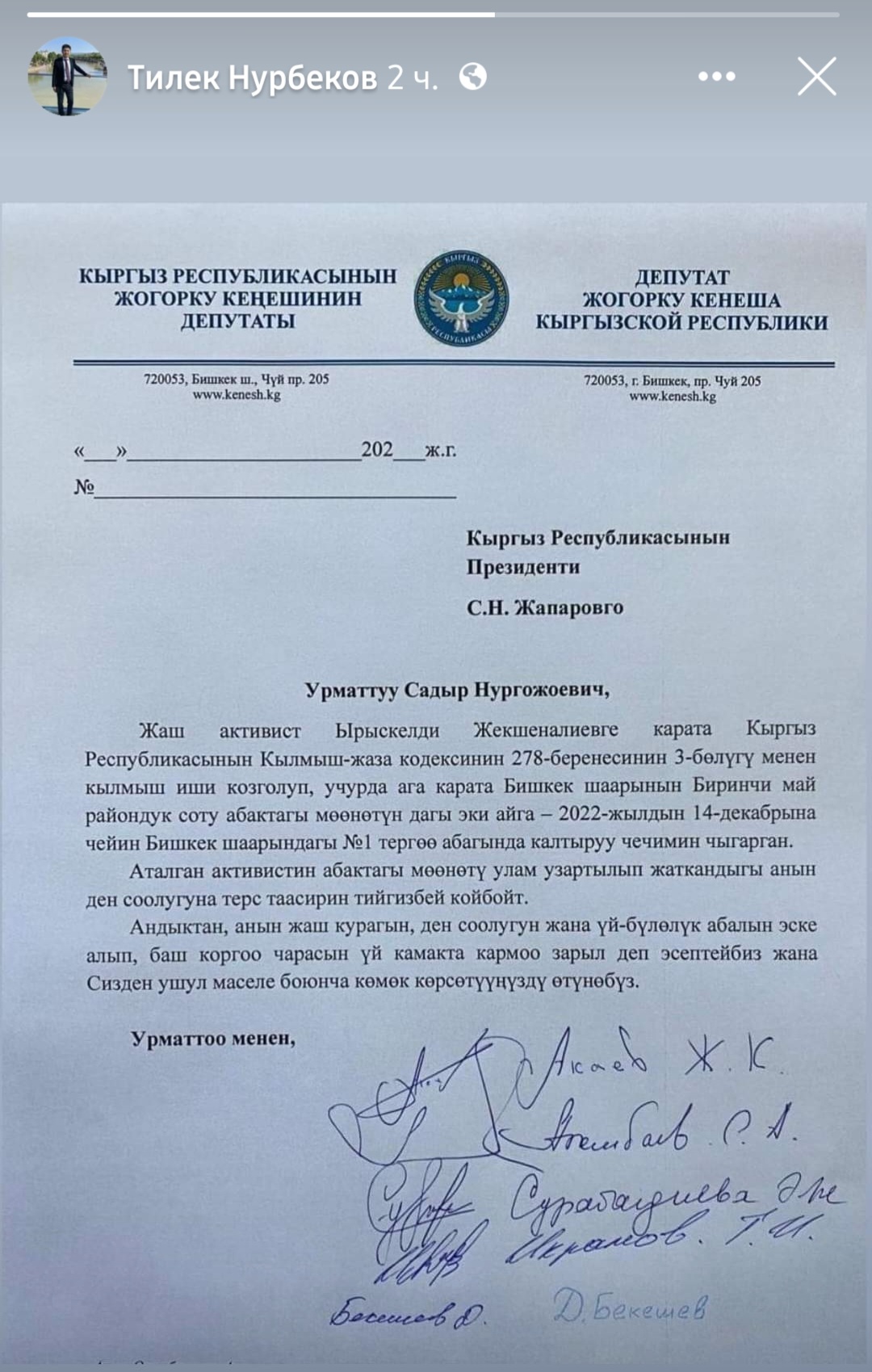 Под обращением подписались депутаты Жанар Акаев, Сеид Атамбаев, Эльвира Сурабалдиева, Тазабек Икрамов и Дастан Бекешев.