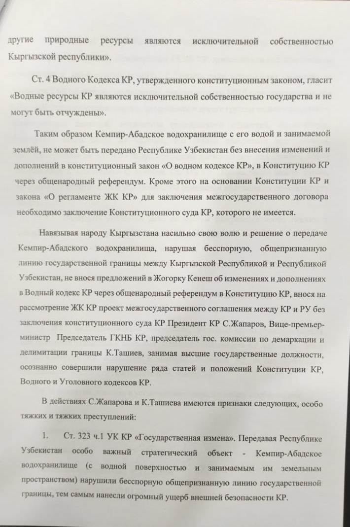 «Водный кодекс говорит, что водные ресурсы Кыргызстана являются исключительной собственностью государства и не могут быть отчуждены. Конституция гласит, что территория КР в пределах ее границ целостна и неприкосновенна. Кроме того, в Основном законе прописано, что земля, ее недра, воздушное пространство, растительный и животный мир, другие природные ресурсы являются исключительной собственностью нашей республики. В действиях Садыра Жапарова и Камчыбека Ташиева есть признаки тяжких и особо тяжких преступлений», — пишет он.