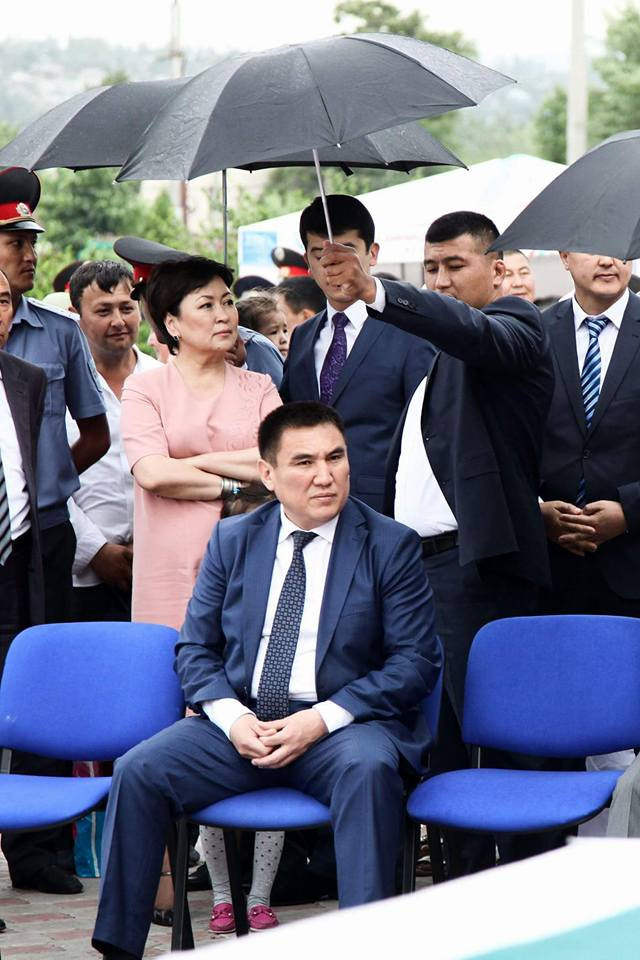 Среди тех, над чьими головами держали зонт, был Таалайбек Сарыбашов. Общественность возмутилась подобным поведением власть имущих. Тогда в Сети запустили флешмоб с зонтиком, высмеивая чинопочитание.