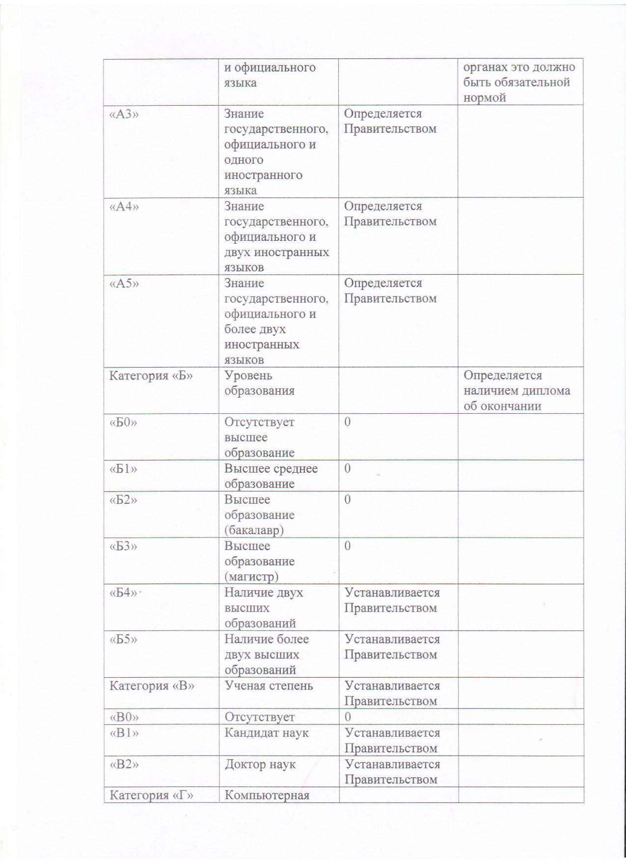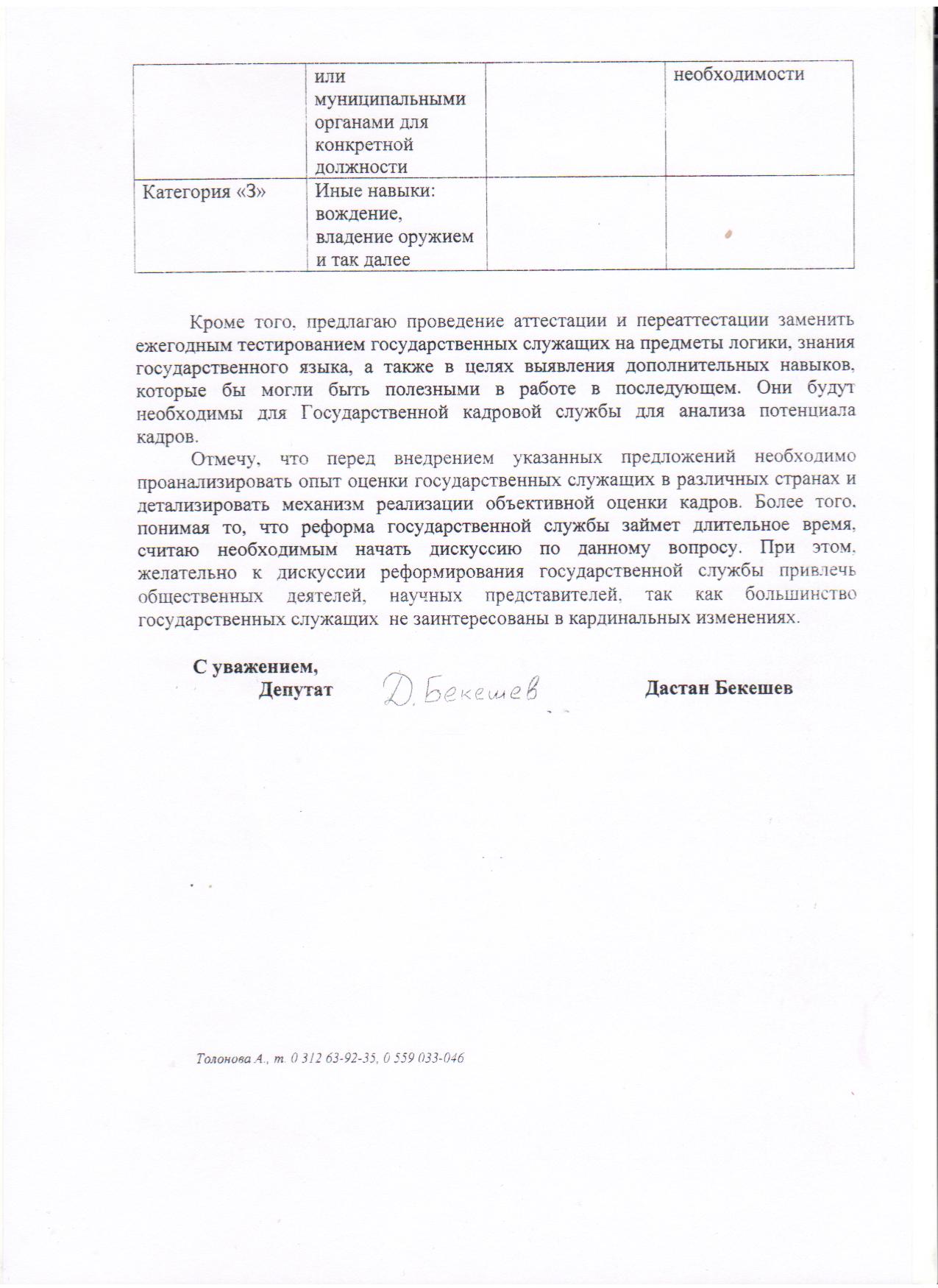Депутат основательно подошел к проблеме, а потому приложил таблицу с условными категориями, по которым и предлагается аттестовывать (ежегодно!) всех служащих государственных и муниципальных органов. По мнению автора, необходимо учитывать знание языков (категория «А»), уровень образования (категория «Б»), ученую степень (категория «В»), компьютерную грамотность (категория «Г»), знание законодательства (категория «Д»), трудовой стаж (категория «Е»). Предлагается принимать во внимание «навыки, устанавливаемые государственными или муниципальными органами для конкретной должности» (категория «Ж») и «иные навыки: вождение, владение оружием и так далее» (категория «З»). Все категории (кроме двух последних) Дастан Бекешев предлагает подразделять на несколько степеней - в зависимости от уровня владения навыками (от нуля до 6, в зависимости от категории).