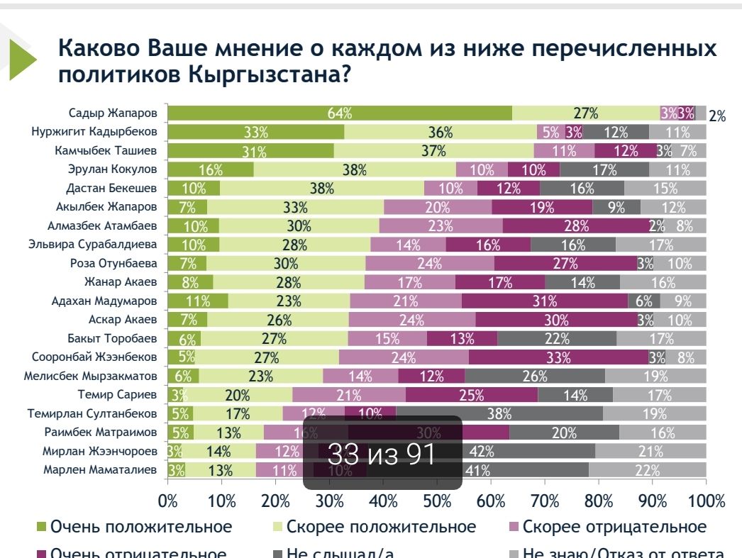 Исследователи также спросили, как кыргызстанцы оценивают политику президента Садыра Жапарова. 64 процента отозвались положительно. Депутат Нуржигит Кадырбеков на втором месте после Садыра Жапарова с показателем 33 процента положительных отзывов.