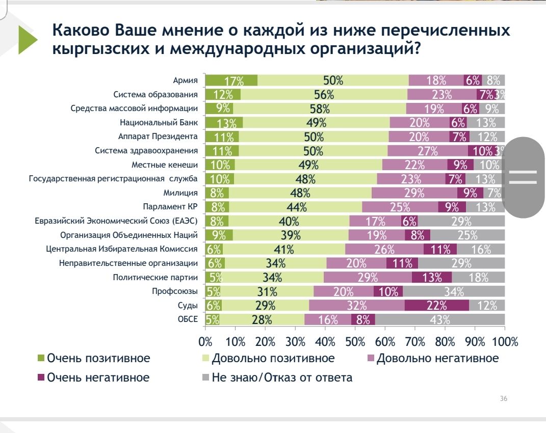 Так, по итогам исследования, роль СМИ в обществе положительно оценили 9 процентов, парламента и милиции — 8 процентов, НКО — 6 процентов, ОБСЕ — 5 процентов. У ЕАЭС и ООН — 8 и 9 процентов соответственно.