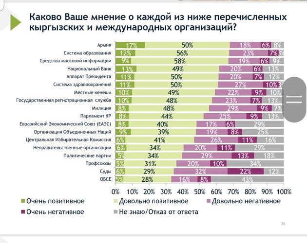 В Кыргызстане положительную оценку регулярной армии поставили 17 процентов опрошенных, а политическим партиям — 5 процентов. Об этом говорится в итогах национального опроса Международного республиканского института.