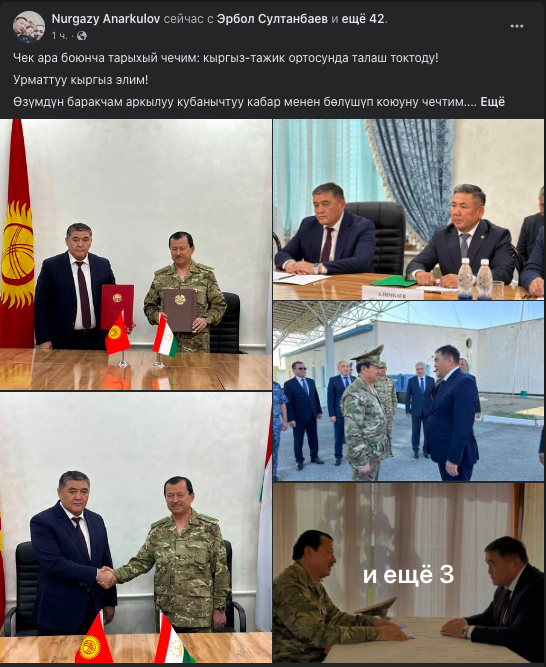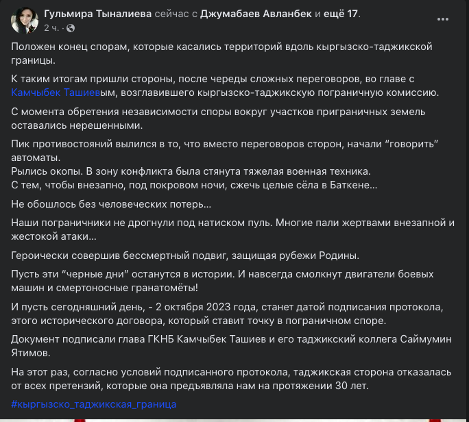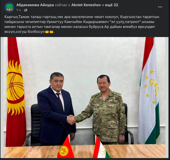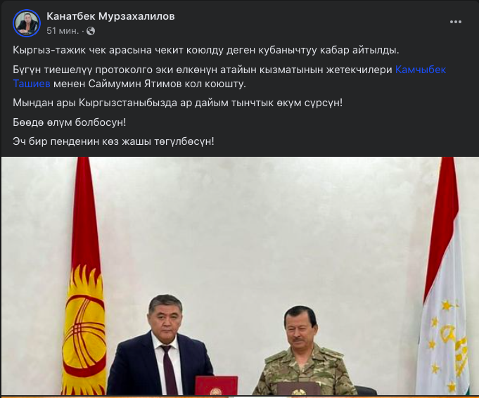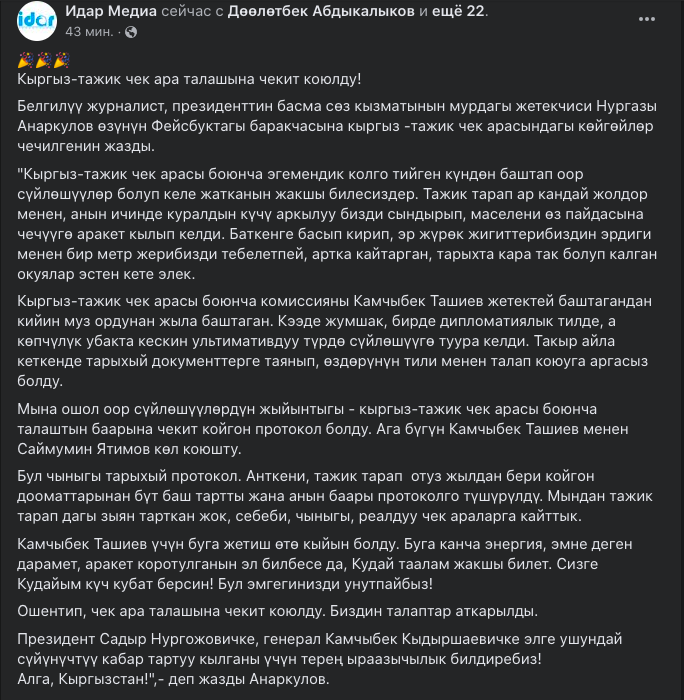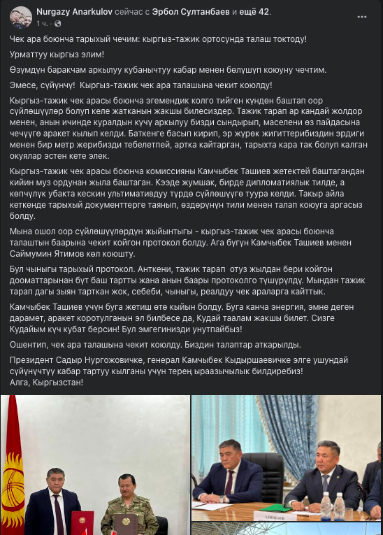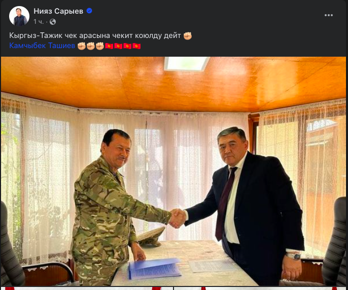 Как только Камчыбек Ташиев возглавил комиссию, лед тронулся. Результатами переговоров стало подписание протокола, который поставил точку в спорах. Его подписали Камчыбек Ташиев и Саймумин Ятимов (председатели ГКНБ КР и РТ. — Прим. 24-kg.com)», — написал бывший глава пресс-службы президента Нургазы Анаркулов.