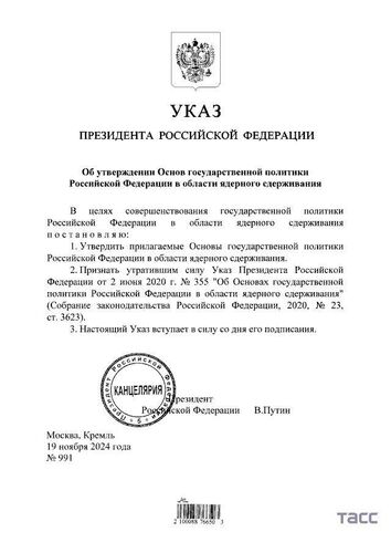 Ранее сообщалось, что в основы государственной политики в области ядерного сдерживания — документ, в котором официально определена и детализирована ядерная стратегия РФ, предложено внести ряд уточнений в части определения условий применения ядерного оружия. Об этом Владимир Путин говорил на совещании Совета безопасности по ядерному сдерживанию. По результатам этой работы предложено внести ряд уточнений в части определения условий применения ядерного оружия.