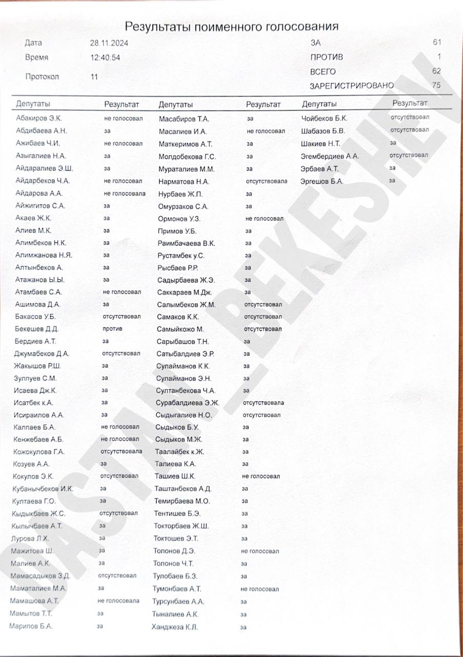Жогорку Кенеш одобрил в первом чтении законопроект, запрещающий снимать милиционеров на видео. Против проголосовал только один депутат — Дастан Бекешев. Он же и опубликовал список коллег, поддержавших документ, в своем Telegram-канале.