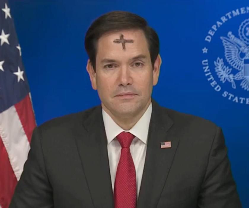 Марко Рубио, исповедующий католицизм, появился в телеэфире с символизирующим покаяние «пепельным крестом» на лбу, знаменующим начало Великого поста и ожидание Пасхи.