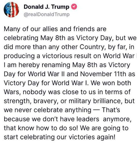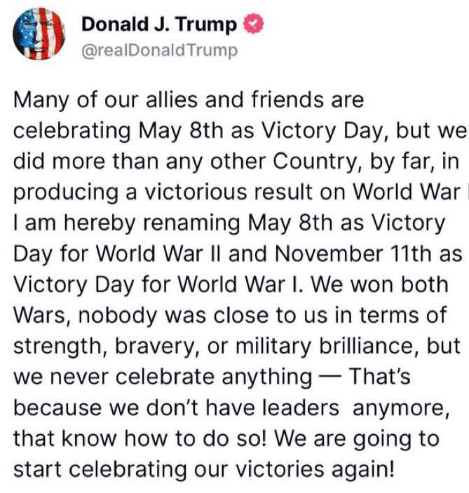 «Многие наши союзники и друзья празднуют 8 мая как День Победы, но мы сделали больше, чем любая другая страна в достижении победного результата во Второй мировой войне. Я переименовываю 8 мая в День Победы во Второй мировой войне, а 11 ноября — в День Победы в Первой мировой войне. Мы выиграли обе войны, никто не был близок к нам по силе, храбрости и военному блеску, но мы никогда ничего не празднуем — это потому, что у нас больше нет лидеров, которые знают, как это делать! Мы снова начнем праздновать наши победы», — написал он.