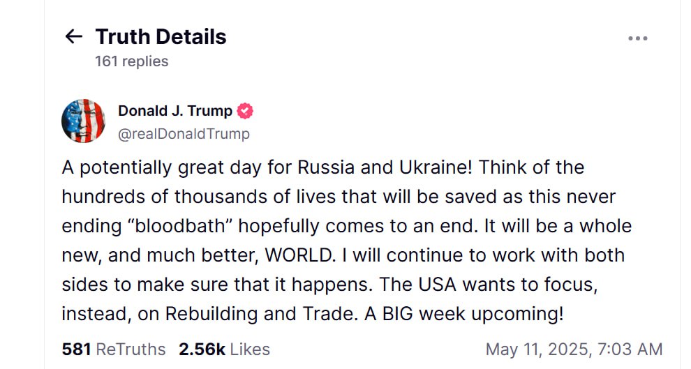 «Потенциально великий день для России и Украины! Подумайте о сотнях тысяч жизней, которые будут спасены, поскольку эта бесконечная «кровавая баня», как мы надеемся, подойдет к концу. Это будет совершенно новый и гораздо лучший мир.