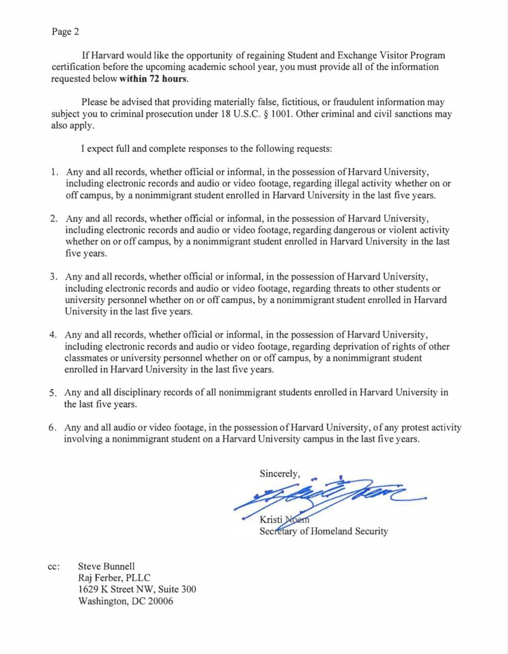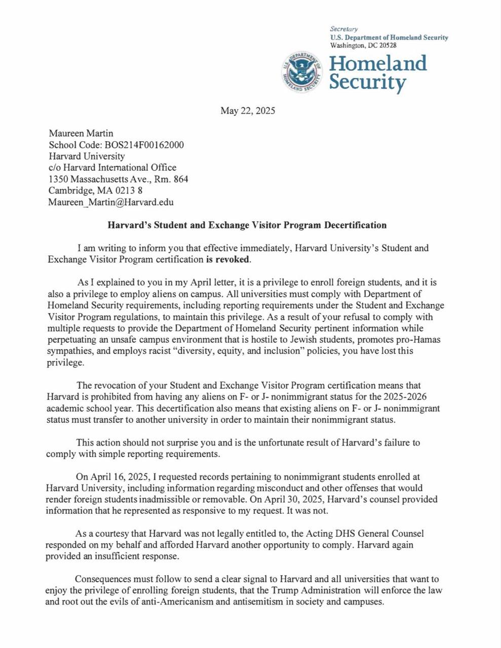 По словам министра внутренней безопасности Соединенных Штатов Кристи Ноэм, это решение должно «послужить предупреждением всем учебным заведениям страны».